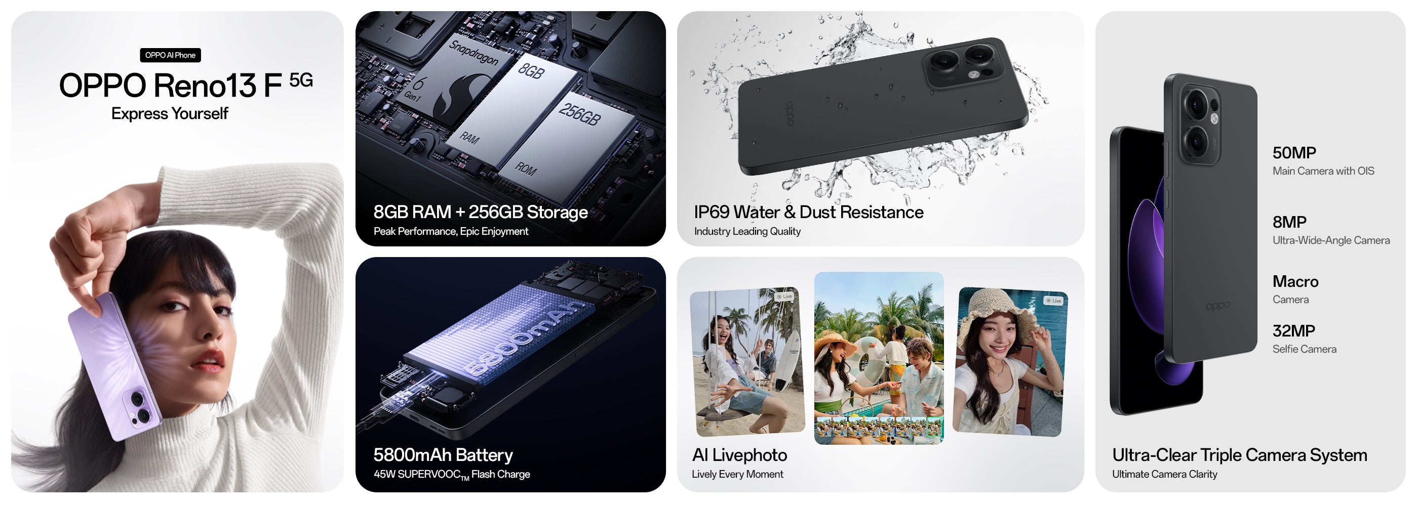Express yourself with the OPPO Reno13 F. Featuring a bold, reimagined style and a powerful 5800mAh battery to keep you going all day. Built with IP68 and IP69 water and dust resistance, it delivers smooth performance with 8GB RAM and 256GB storage. Capture stunning photos with the Ultra-Clear Triple Camera System and enjoy easy connectivity with eSIM support.